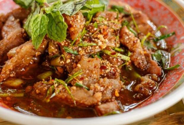 Тщательно промытое мясо отваривают в подсоленном кипятке, охлаждают и нарезают полосками. На следующем этапе говядину соединяют с предварительно почищенными овощами и поливают заправкой, сделанной из толченого чеснока, специй, соевого соуса, постного масла и бальзамического уксуса.