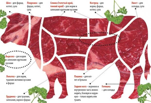 Все знают вырезку, филей, толстый и тонкий край – наиболее «престижные» куски говядины. Однако составляющих говяжьей туши гораздо больше, и у каждой в кулинарии свое предназначение. Грудинка подойдет для наваристых супов,кострец с «сахарной» костью – для прозрачных бульонов. Супы варят и из лопатки, а голяшка, которая в классификации относится ко второму (т. е. к последнему после высшего и первого) сорту говядины, идет на студень. Лучший бефстроганов – из оковалка с кострецом (это внутренняя часть бедра). Тартар и карпаччо – только из вырезки. Шашлык – это вырезка, толстый и тонкий край, мягкое мясо с костреца. Жарить рекомендуют мясо высшего сорта, а все остальное лучше запекать или тушить.