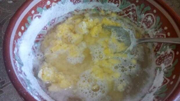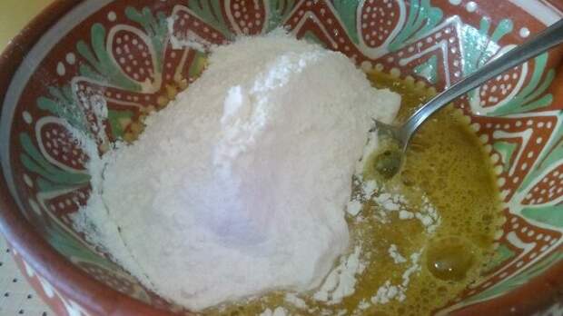 - Всыпаем муку (3-4 столовых ложки). Все тщательно размешиваем, получается очень густая, похожая на тесто смесь. Вливаем минералку (примерно треть стакана).
