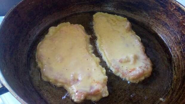 - Отбитые ломтики свинины обмакиваем со всех сторон в кляр и сразу выкладываем на разогретую с растительным маслом сковороду.