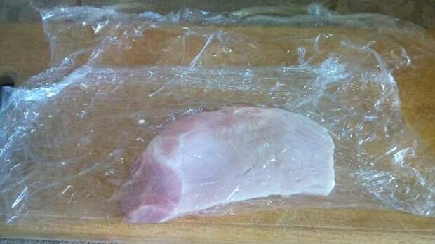 - Выкладываем свиные ломтики на доску, заворачивая с обеих сторон в пищевую пленку. Так в процессе отбивания сок из мякоти не будет брызгать во все стороны.
