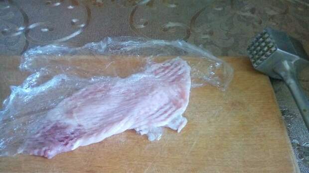 - Отбиваем свинину специальным молоточком. У меня мясо очень мягкое и нежное, поэтому я использовала только мелкую сторону молотка.
