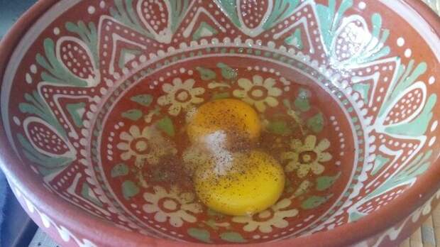 - Теперь можем заняться приготовлением кляра. 2 яйца смешиваем с солью и черным молотым перцем.