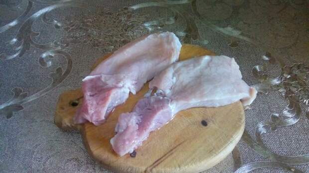 - Мясо тщательно промываем холодной водой. Нарезаем свиную мякоть вдоль волокон на ломтики, толщиной не более 1,5-2 сантиметров.