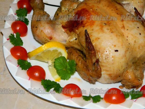 После маринования курицу положить в пакет для запекания (можно в фольгу) и поставить в духовку при температуре 200 градусов минут на 50. Затем разрезать пакет и поставить ещё минут на 10-15 для подрумянивания.