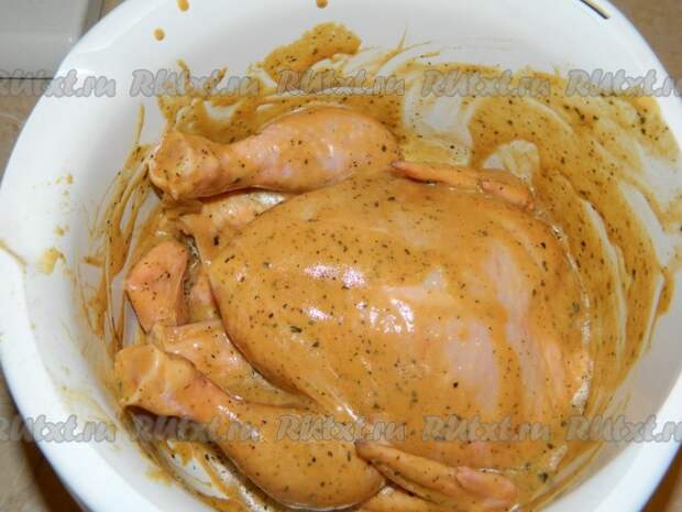 Обмазываем курицу хорошенько со всех сторон горчично-соевым соусом и убираем в холодильник не меньше, чем на час. У меня была замаринована утром и стояла до вечера. В итоге мясо было пропитано ароматным соусом до самых костей.