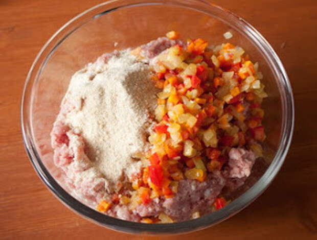 В миске кладем фарш, обжаренные овощи, мелко нарубленный бекон, перчики чили, сухари, яйца и специи.