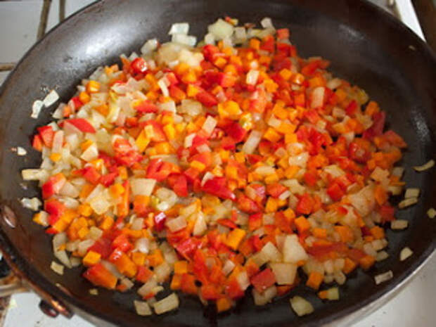 В сковороде на среднем огне разогреваем 2 ст.л. растительного масла. Кладем овощи и жарим до мягкости, около 7-8 минут.